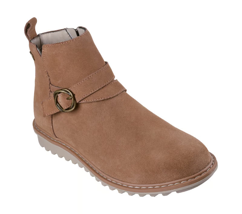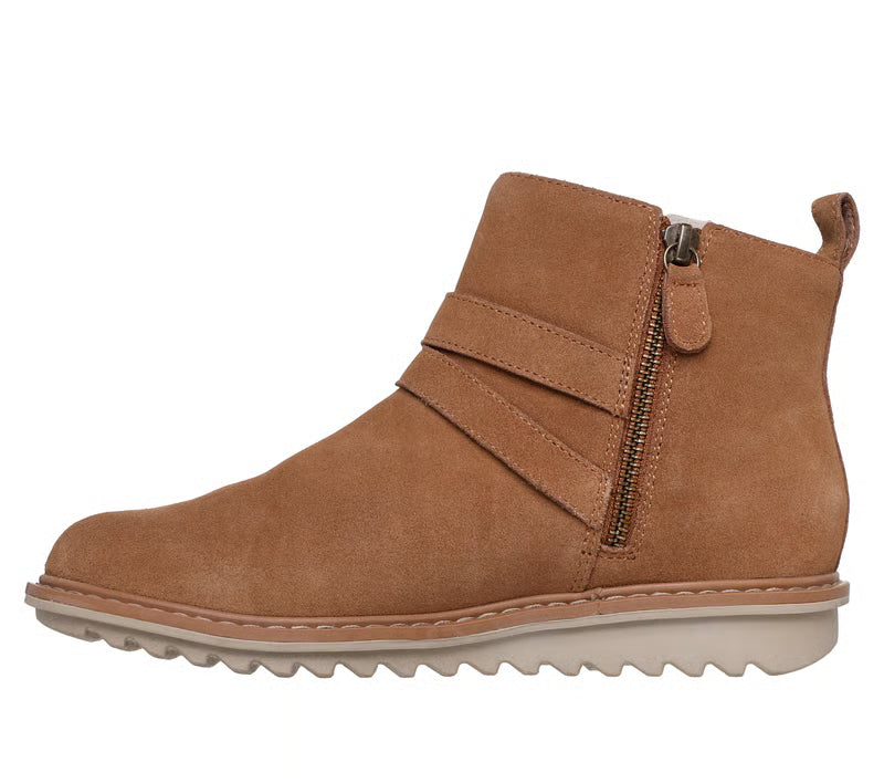 Step into the season with stylish supportive comfort wearing Skechers Arch Fit® Mojave - Bountiful Aura. This ankle boot features a genuine suede upper with a side zip closure, deco instep straps with accent buckle, and a removable Arch Fit® cushioned insole.