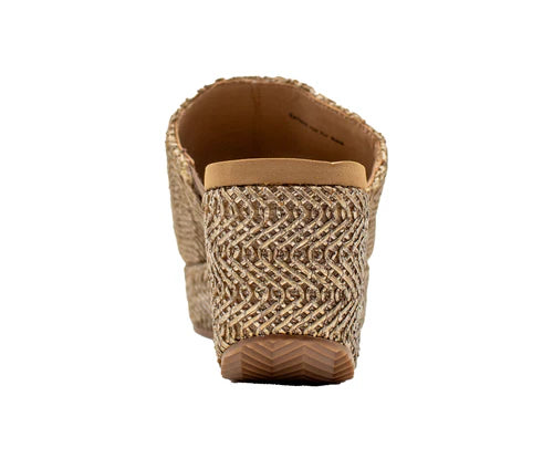 - Woven synthetic raffia upper with metallic finish and inside elastic gore for comfort