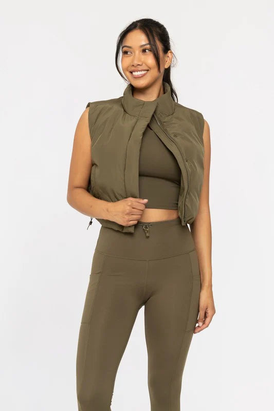 Stay cozy and stylish with this Cropped High Neck Puffer Vest! The cinched bottom traps warmth right where you need it, while side-entry welt pockets stash your essentials safely. A full zipper with snap buttons leads up to a snug high neck, guarding you against chilly winds. Perfect for adding a playful edge to your cold-weather wardrobe.