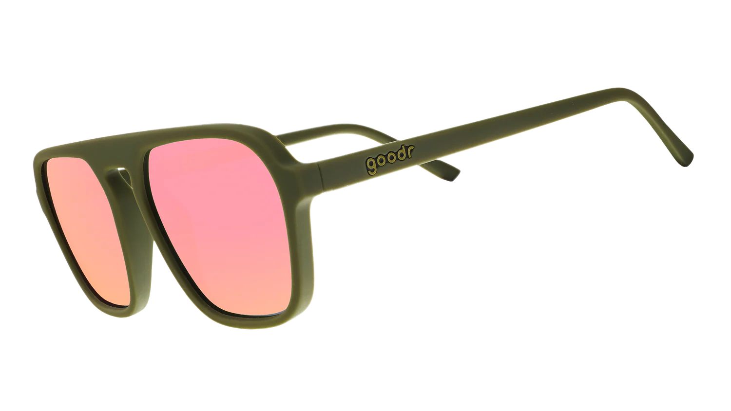 How many Dirty Martinis does it take before you start seeing time dilation?! With these dark green Retro Gs and their light pink reflective lenses, you might be the first to crack the spacetime continuum with the perfect Dirty Martini in hand!