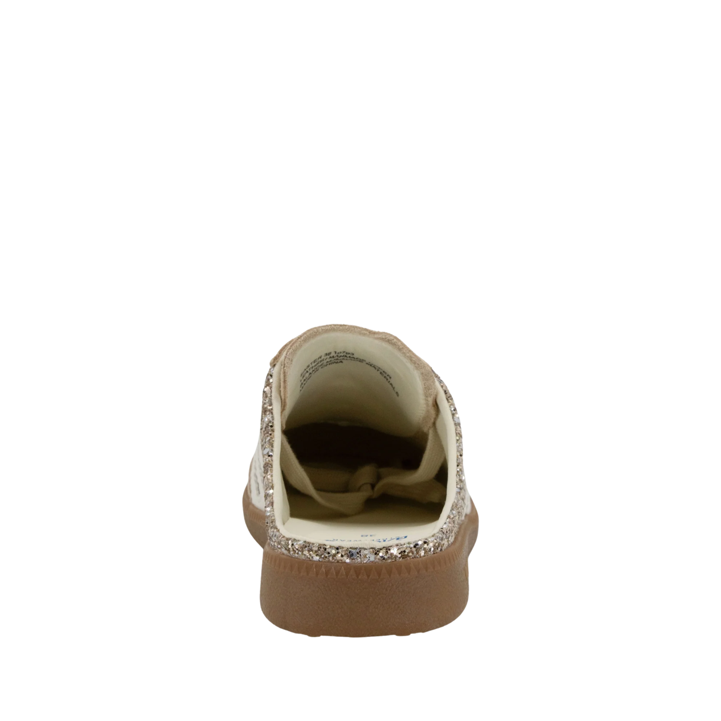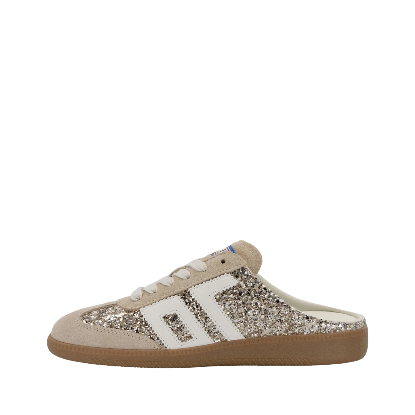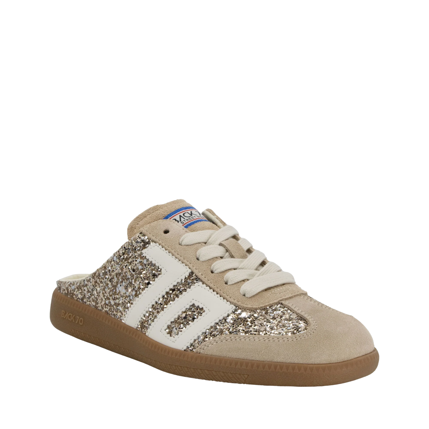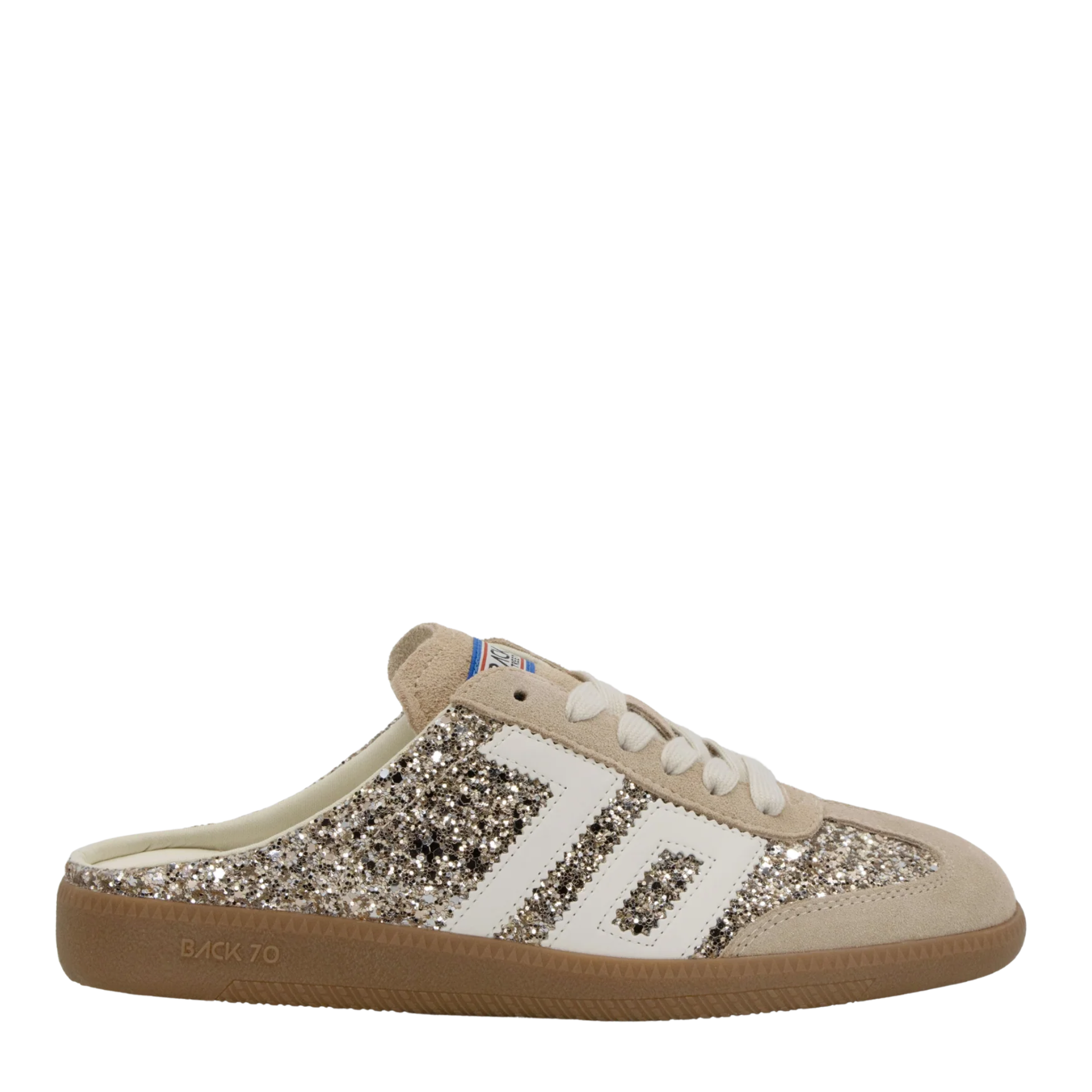 The Back 70 glitter mule brings sparkle to everyday style with a distinctly feminine, boho edge. Designed in shimmering gold glitter, this effortless sneaker mule blends laid-back charm with the brand’s signature vintage detailing. The open-back silhouette adds ease and personality, while subtle suede trims and retro accents keep it unmistakably Back 70. A perfect mix of glamour and casual cool, it’s made for the girlie girl who loves her sneakers with a little shine.