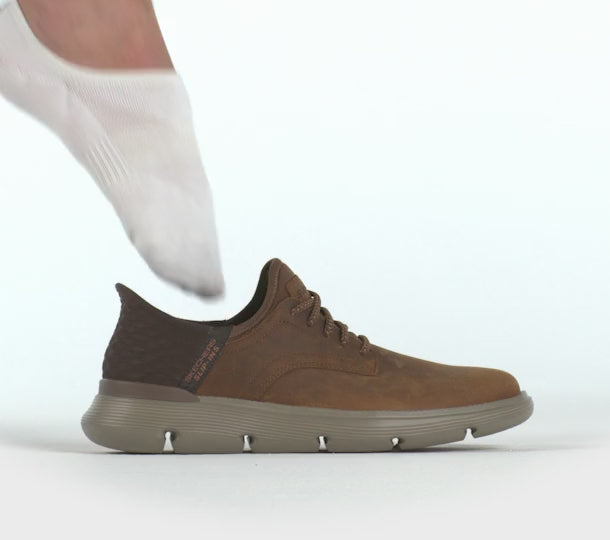 Master your efficiency with a comfortable business casual look wearing Skechers Hands Free Slip-ins®: Garza - Gervin. This TOUCHLESS FIT® Oxford style features a smooth leather upper with stretch laces, a Skechers Slip-ins® molded heel panel, a charcoal-infused Skechers Air-Cooled Memory Foam® insole, and a Skechers Goga Mat Arch™ for added support.