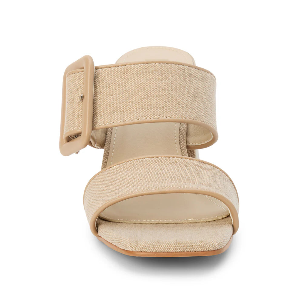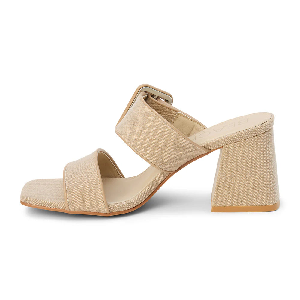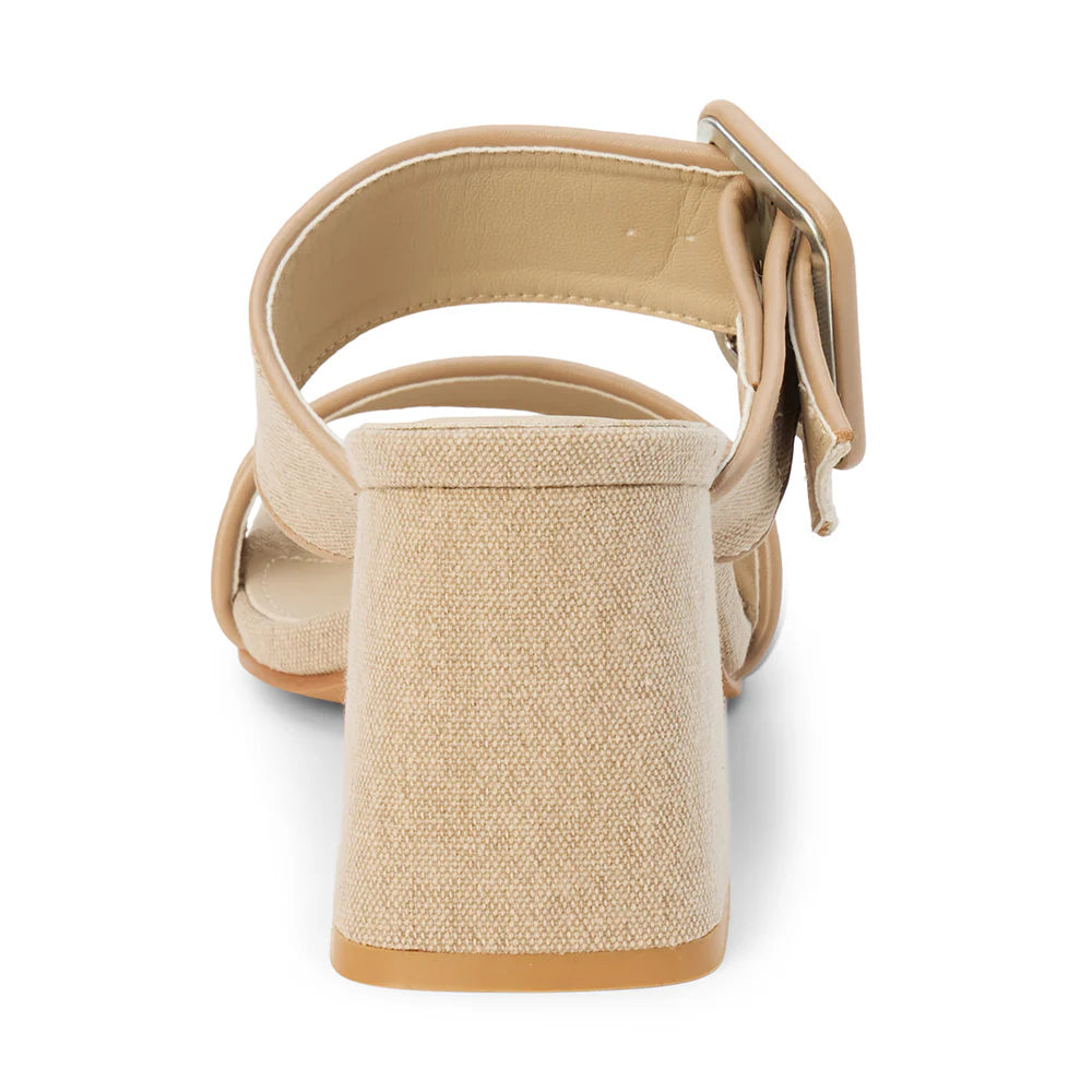 The Lucy vegan heeled sandal by Beach by Matisse showcases a sand-colored textile upper with a wide strap, statement buckle, and versatile block heel.