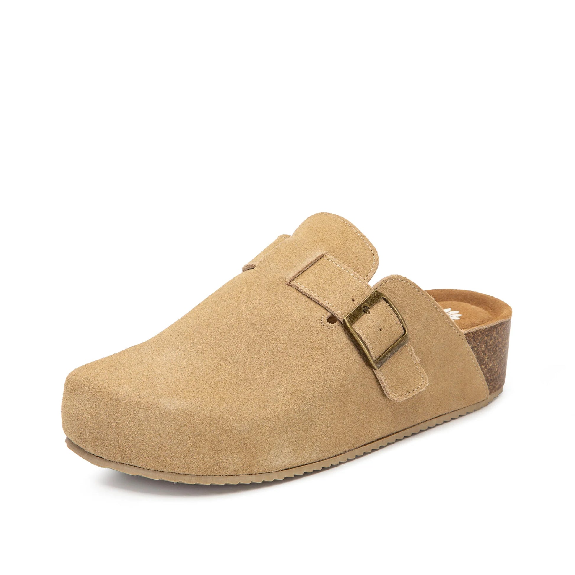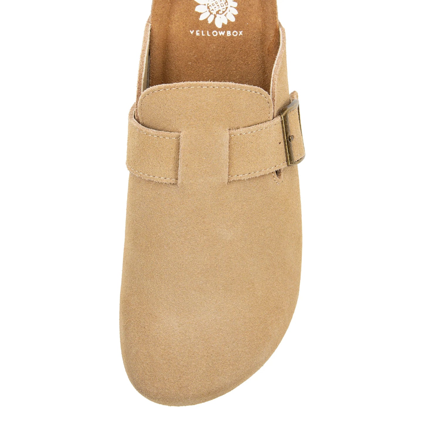 Elevate your style with Yellow Box's MAIRE flatform clog, featuring a genuine cow suede upper and a lightweight cork-mix sole for all-day comfort.