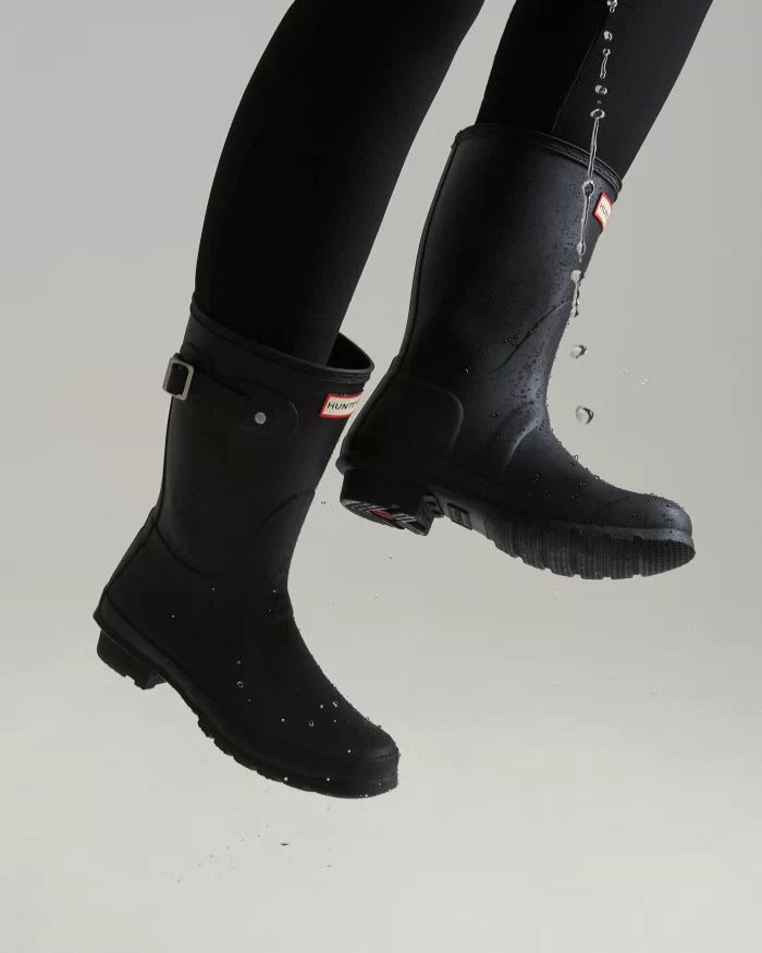 Perfect for wet weather conditions this women's Rain Boot Boot is a shorter version of the iconic Hunter Original Tall Boot. Formed of natural rubber, each boot is handcrafted and assembled over three days before being vulcanized for superior protection. Featuring the Hunter Original tread pattern, and a comfortable polyester lining, this black waterproof boot is a rainy-day necessity.
