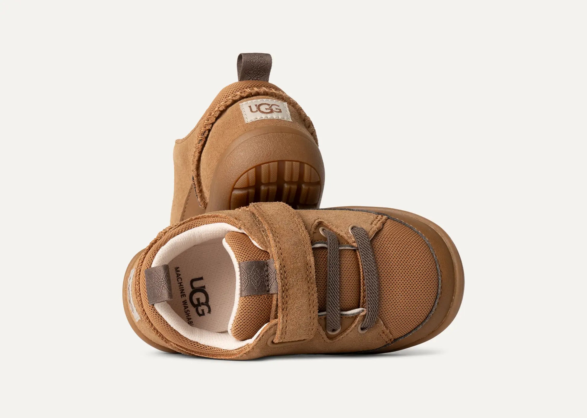 Does your little one love to roam? The Adventurer Sneaker can't wait to tag along. This explore-ready shoe is designed to be easy for them (and you) with completely washable suede and a hook-and-loop strap to keep them in place. Kiddos will be comfy with the breathable lining from recycled textiles and a soft foam footbed. Finished with the iconic UGG® elements like our Twin Seam and License Plate logo patch.