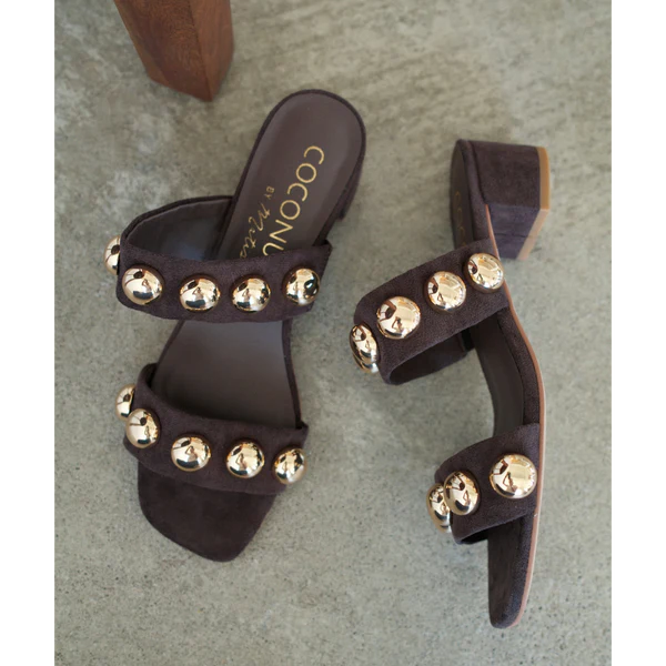 Vegan two-strap sandal with oversized dome studs and low block heel.
