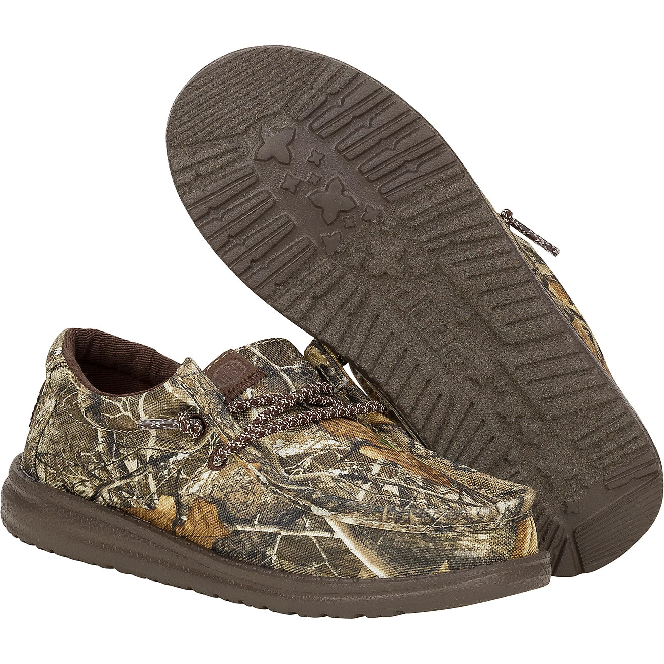 The HEY DUDE Kids' Wally Realtree Shoes are stylish and comfortable slip-on shoes featuring a Realtree camouflage pattern. These shoes are perfect for kids who love the outdoors and want a casual, comfortable shoe.